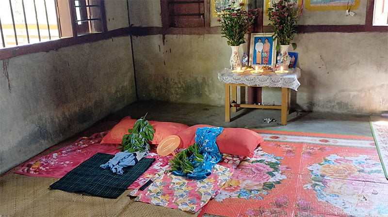 “တောင်းပန်တဲ့ကြားကနေပြီးတော့မှ အဖေနဲ့အမေကို လုပ်သွားလိုက်ကြတာ။ အမေကို လည်ပင်းကို ဒီလိုမျိုးတိုင်းပြီးတော့မှ သူ့သားကြီးကနေ သူကိုင်ထားတဲ့ဓားကနေ တစ်ချက်ထိုးလိုက်တယ်။ အဲ့လိုထိုးနေစဉ်မှာပဲသူအမေကနေပြီးတော့ ခေါင်းကိုဒုတ်နဲ့ရိုက်ပြီး သူ့သားကို သားသတ်၊ မသေမချင်းသတ် ဆိုပြီး အမေ့ရဲ့ခေါင်းမှာအချက်ပေါင်းမနည်း ရိုက်လည်းရိုက်တယ်။ လက်တွေမှာရော အကုန်ရိုက်တာ သူ့သားကလည်း ဓားတွေနဲ့ထိုးနေတယ် အချက်ပေါင်းများစွာ အမေ့ကိုလုပ်နေတာ အဖေ့ကိုကျတော့ ဖိုးလုံးရယ် သူ့အဖေရယ် ဓားနဲ့ထိုးနောက်စေ့တွေမှာရောရိုက် မျက်နှာကလည်းကွဲပြဲ အဖေအိမ်ထဲကိုပေါ့နော် သူအရမ်းထိထားပြီဆိုတော့ အိမ်ထဲကိုဝင်လာတာ”ဟု မမျိုးသန္တာဌေးကပြောသည်။