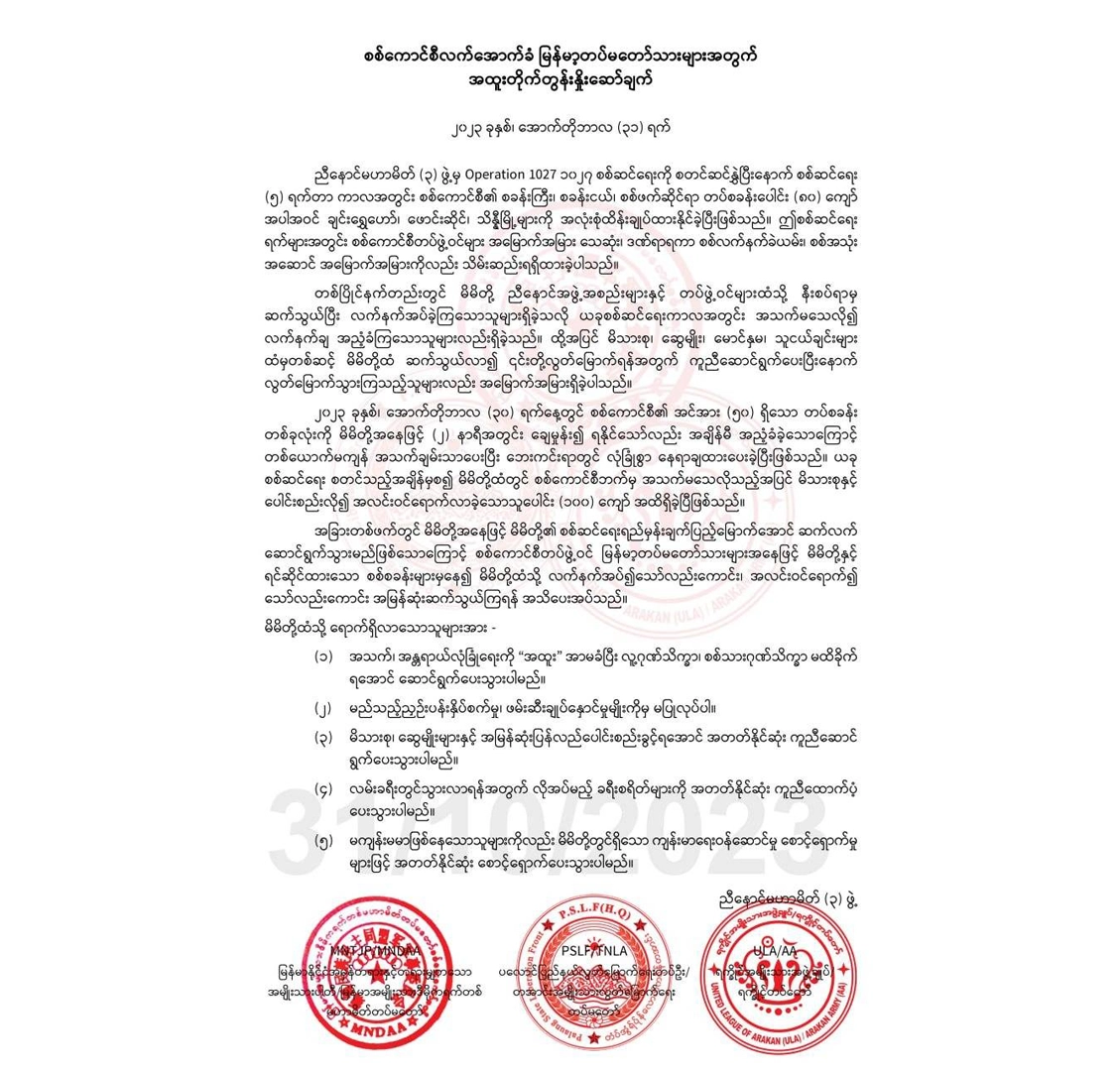 ညီနောင်သုံးဖွဲ့အနေနဲ့ စစ်ရေးရည်မှန်းချက်ပြည့်မြောက်အောင် ဆက်လက်ဆောင်ရွက်မှာ ဖြစ်တာကြောင့် စစ်ကောင်စီတပ်သားတွေ အနေနဲ့ လက်နက်အပ်တာဖြစ်စေ၊ အလင်းဝင်ရောက်တာဖြစ်စေ အမြန်ဆုံးဆက်သွယ်ကြဖို့လည်း တိုက်တွန်းထားပါတယ်။