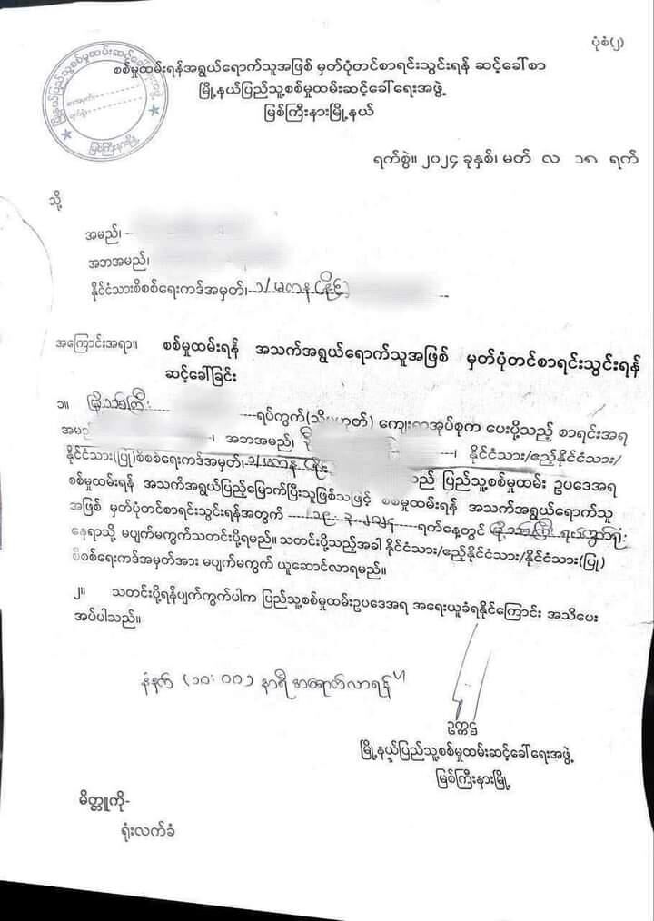 မှတ်ပုံတင်စာရင်းသွင်းဖို့ သတင်းပို့လာရောက်ခဲ့တဲ့အခါ နိုင်ငံသားစိစစ်ရေး ကတ်အမှတ်ကိုလည်း မပျက်မကွက် ယူဆောင်လာရမယ်လို့လည်း ရေးသားထားတာ တွေ့ရပါတယ်။