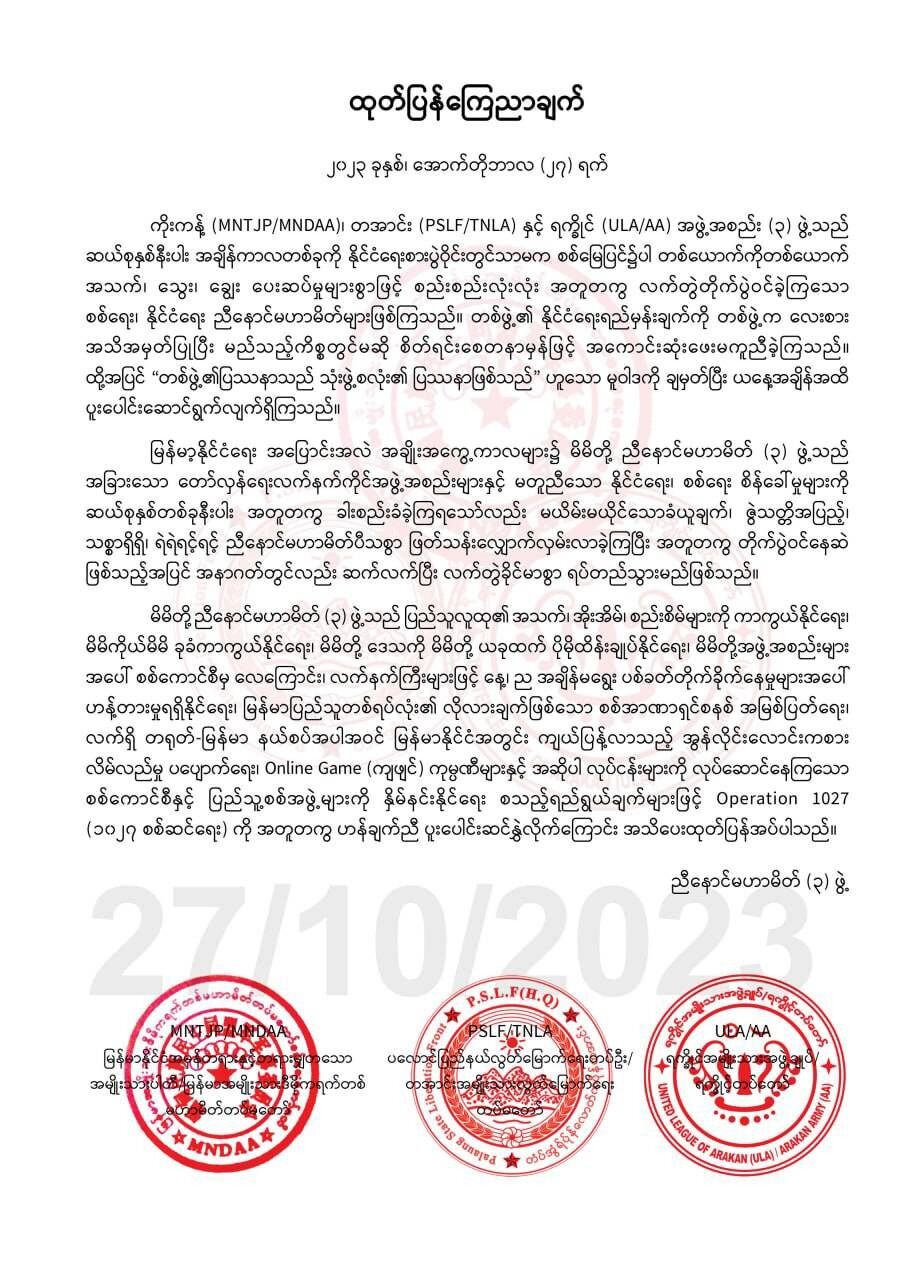 အွန်လိုင်းလောင်းကစား လိမ်လည်မှုပပျောက်ရေးအတွက် အဲဒီလုပ်ငန်းတွေလုပ်နေတဲ့ စစ်ကောင်စီနဲ့ ပြည်သူ့စစ်အဖွဲ့တွေကို နှိမ်နင်းဖို့အတွက် ၁၀၂၇ စစ်ဆင်ရေးကို ဟန်ချက်ညီ ပူးပေါင်းဆင်နွှဲလိုက်ပြီလို့ မြောက်ပိုင်းမဟာမိတ်ညီနောင်များအဖွဲ့က ပူးတွဲကြေညာလိုက်ပါတယ်။
