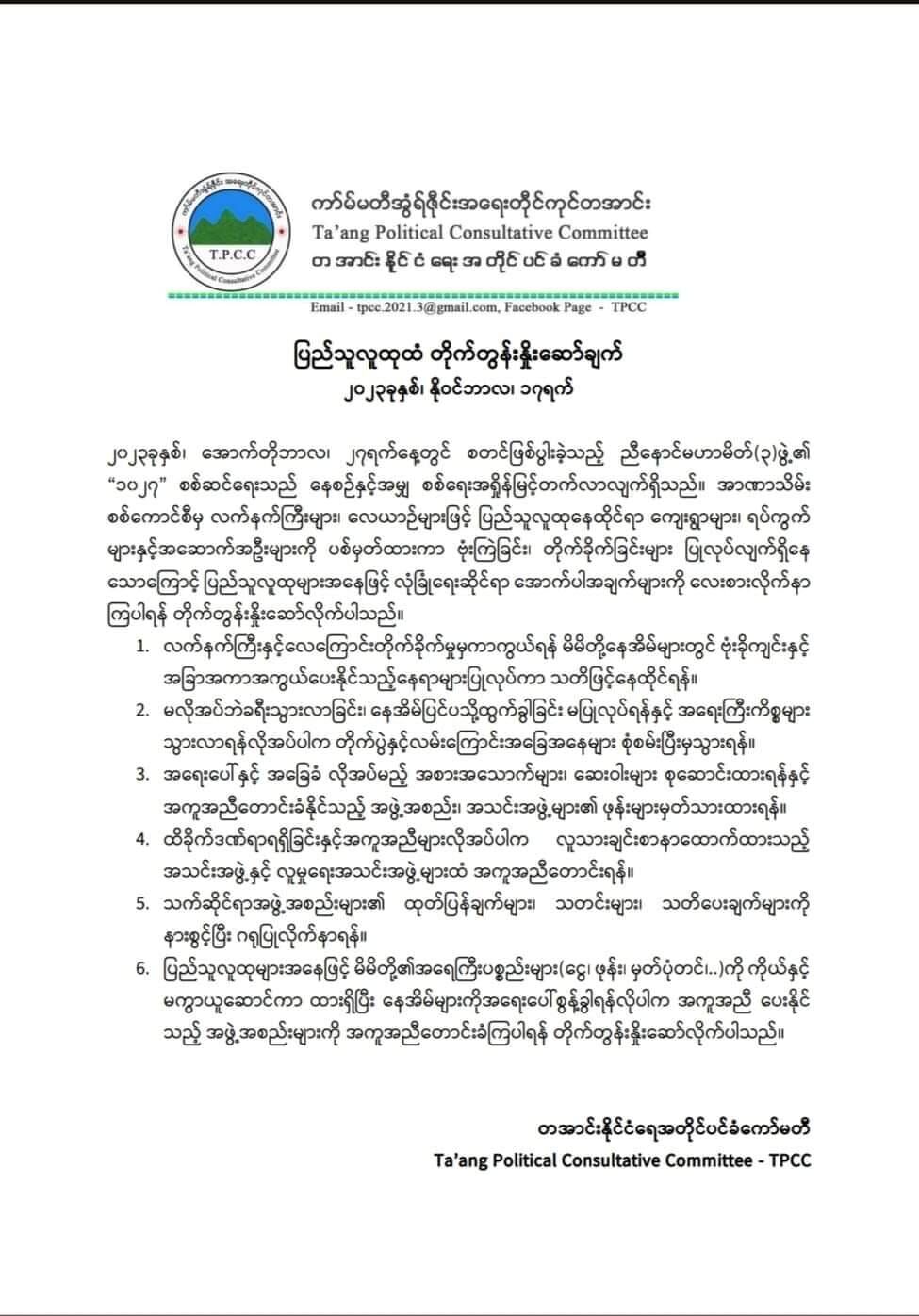 ပြည်သူလူထုနေထိုင်တဲ့ နေရာတွေကို လက်နက်ကြီးတွေ လေယာဉ်တွေနဲ့ ပစ်ခတ်တိုက်ခိုက်တာတွေ လုပ်ဆောင်နေတာကြောင့် ပြည်သူတွေအနေနဲ့ နေအိမ်တွေမှာ ဗုံးခိုကျင်းတွေပြုလုပ်ပြီး သတိနဲ့နေထိုင်ဖို့ တအောင်းနိုင်ငံရေးအတိုင်ပင်ခံကော်မတီ (TPCC) က ဒီကနေ့ နိုဝင်ဘာ ၁၈ ရက်နေ့မှာ ထုတ်ပြန်ထားပါတယ်။