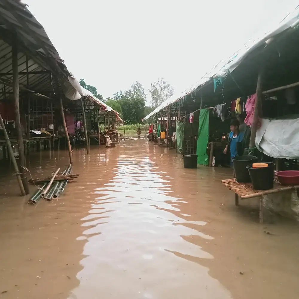 စစ်ရှောင်စခန်းအတွင်း အခုလို ရေဝပ်လေ့ရှိတာကြောင့် သဲကျောက်ခင်းဖို့အတွက် အကူအညီတွေ လိုအပ်နေတာလို့ စစ်ရှောင်ပြည်သူတစ်ဦးက မြစ်ကြီးနားသတင်းဂျာနယ်ကို အခုလို ပြောပါတယ်။
